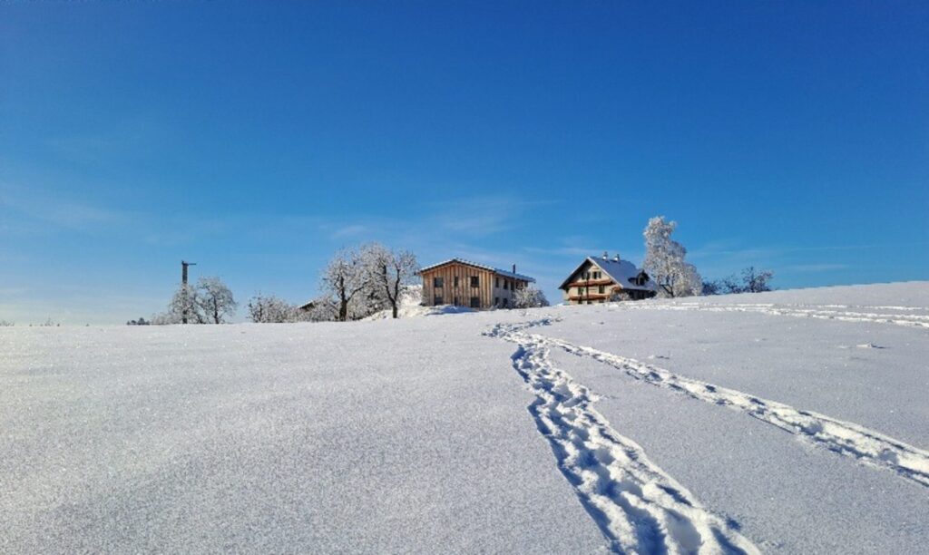 Seit dem Neubau des Hauses, welches zum grossen Teil aus Mondholz vom eigenen Wald besteht, dürfen wir Gäste bei uns empfangen.